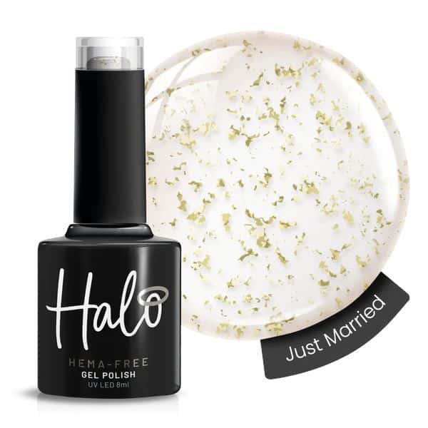 Halo Gel Polish Just Married is a clear gel polish with delicate gold flecks, symbolising the golden glow of new beginnings and cherished vows.