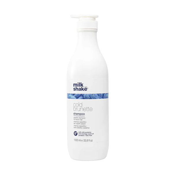 milk_shake Cold Brunette Shampoo 1l is a specific backwash size shampoo for brown hair. The special blue pigments contained within the new milk_shake cold brunette range, counteracts the red/orange tones in brown hair, remove unwanted warm tones and make cool toning treatments last longer. It is ideal for natural or color-treated brown, light brown or dark blonde hair. SLES & Paraben free.