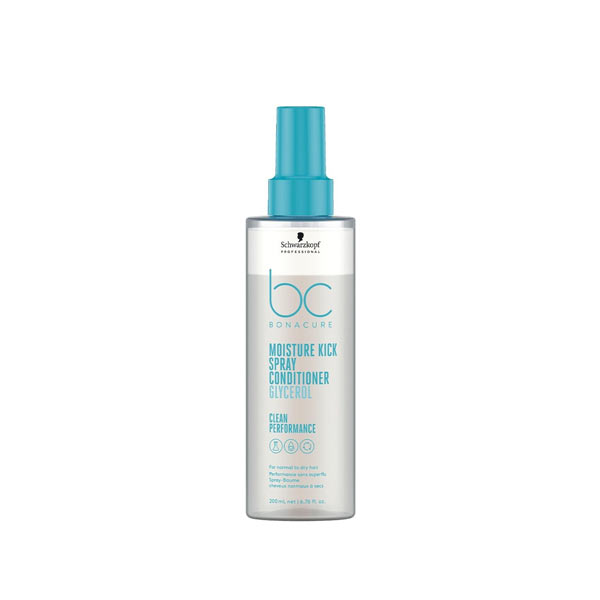 Schwarzkopf Bonacure Moisture Kick Spray Conditioner 200ml s a leave-in spray conditioner that instantly detangles and hydrates normal, dry, textured, brittle or curly hair types, improving overall condition whilst imparting brilliant shine and bounce.