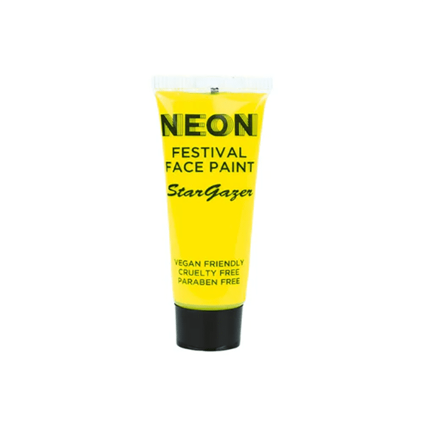 The Neon Festival Face Paints low under UV light (Ultraviolet Light or Backlight). The vegan and paraben-free formula is waterproof after application, so it will not run with sweat. Perfect for Neon parties, Raves, Night Clubbing, Festivals, and anywhere you want the brightest colour. The colours have fantastic coverage with rich colour finishes. These colours are easily removed with soap and water. The face paints are made in the UK and are cosmetically approved.