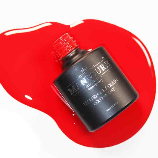 The Manicure Company Red Carpet 205 gel nail polish is a bright true fire engine red. A classic and timeless shade.